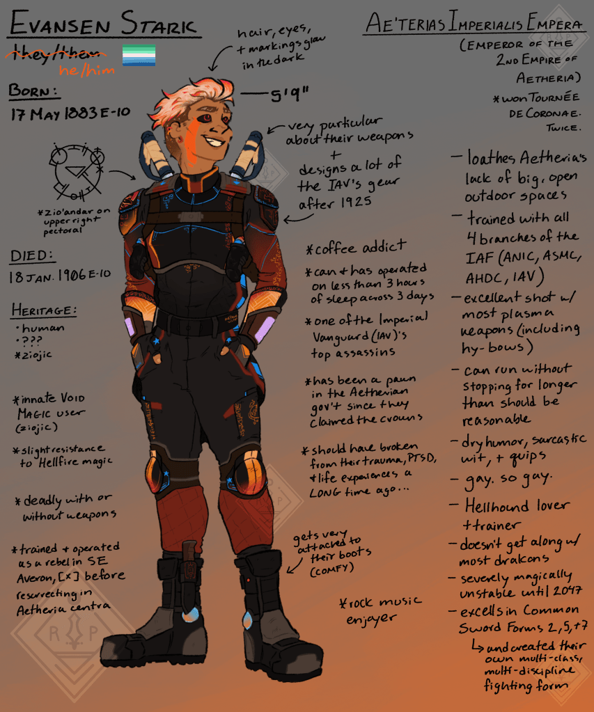 This project takes place across several worlds, including Aetheria, Tartarus, and [ x ]. It also takes place over nearly 100 years in the “modern” Era of Broken Dimensions, Era 10 (1906-2047).